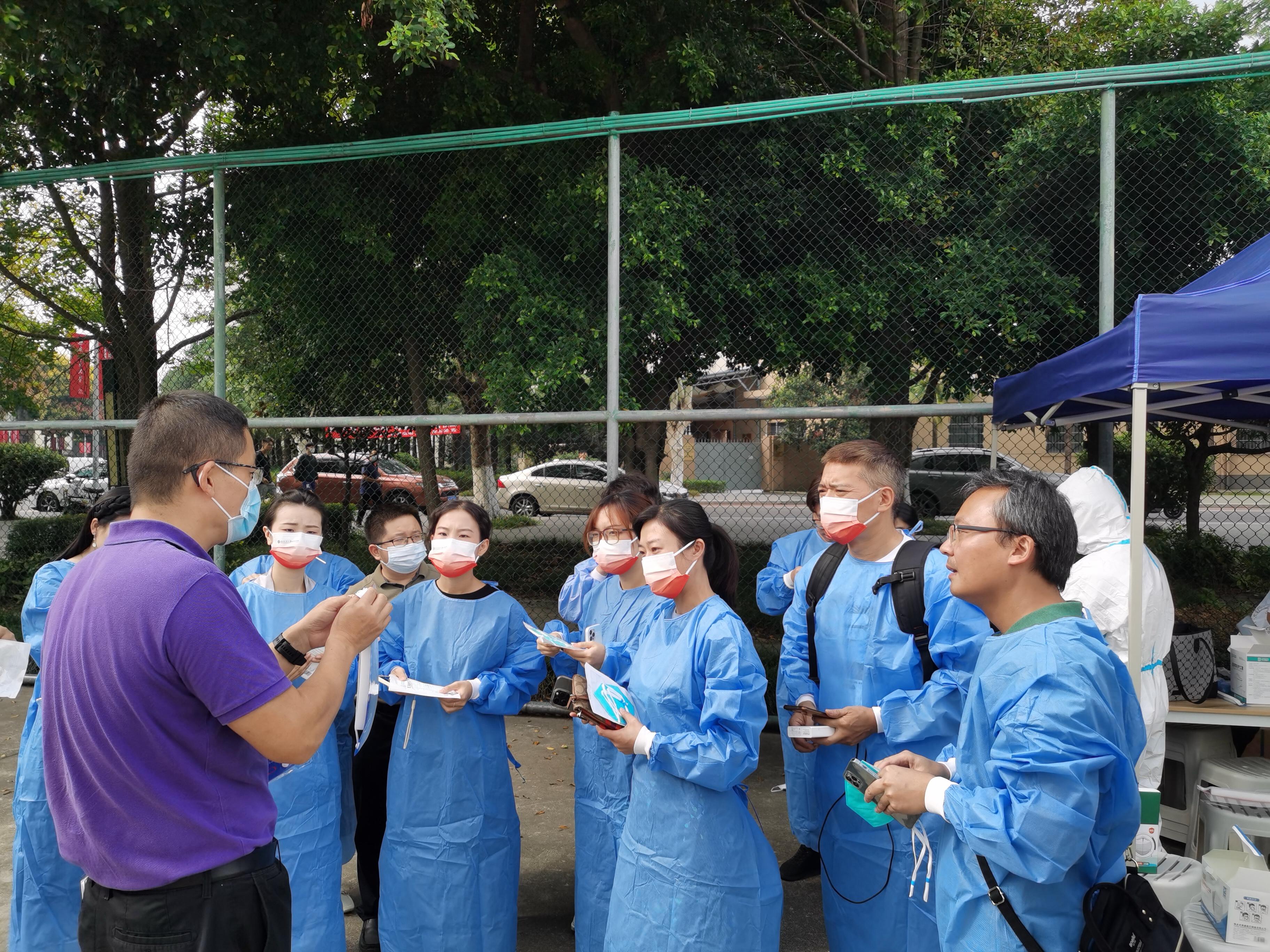 下午3时,学院12名党员志愿者老师在党委书记王斌、副书记杨宏毅的带领下来到核酸检测现场。经学生工作部副部长李毅培训和统一分工后,志愿者们先穿戴好防护用品,随即有序来到分派岗位进行志愿服务工作。
