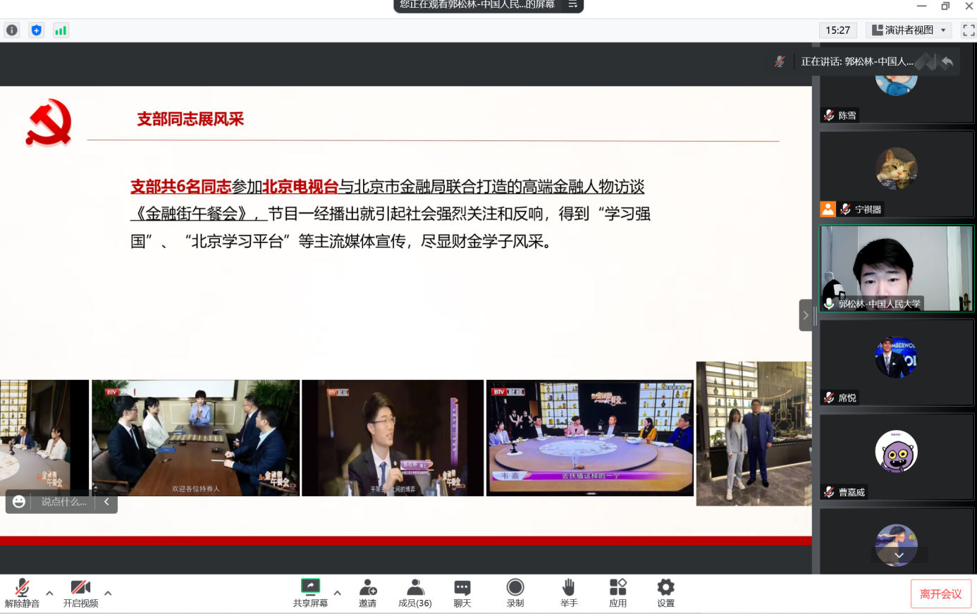 博士第二党支部的席悦同志和中国人民大学财政金融学院2019级金融博士党支部的郭松林同志共同主持,两个党支部的全体党员参加此次活动。