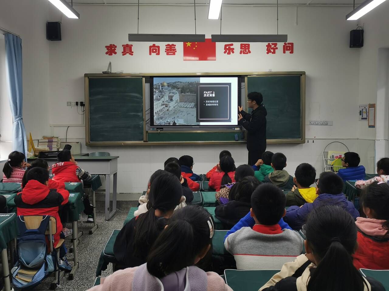 在第一部分中,为帮助同学们更好地理解此次巴以冲突的起因,申家恒同志首先用生动的幻灯片为子弟小学的同学们就巴以的地理位置等背景信息展开了详细讲解;随后,张新月同志就五次中东战争分别展开了叙述;紧接着,周馨瑶同志、余万芝同志就巴以双方的经济形态、冲突发生的原因、战争情况部分进行了深入讲解。